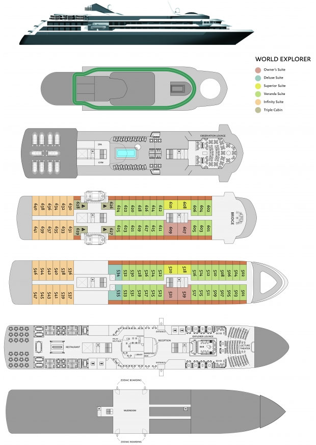An “all balcony suites” ship, World Explorer features amenities and guest comforts to maximize the exploration off and on the ship and deliver an unequalled Polar expedition experience. Distinct and comfortable, refined and roomy—these attributes and more describe World Explorer. Not only is it among the fastest expedition ships, it is also one of the finest, with six tiers of deluxe accommodation. The personal space is exceptional. Every suite has either a private walk-out or French balcony for direct ocean views. World Explorer also delivers plenty of public areas to unwind in after a day outdoors, including the glass-domed Observation Lounge for quiet contemplation and full skyline views, the Explorer Lounge for a drink and a chat, and the library for more intimate relaxing and reading. Presentations and discussions are facilitated in a dedicated lecture theatre. Health and wellness facilities feature an outdoor track, a small gym and a sauna, plus a spa with change rooms, showers and lockers. For the active adventurers, add-ons include kayaking, camping and stand-up paddleboarding.