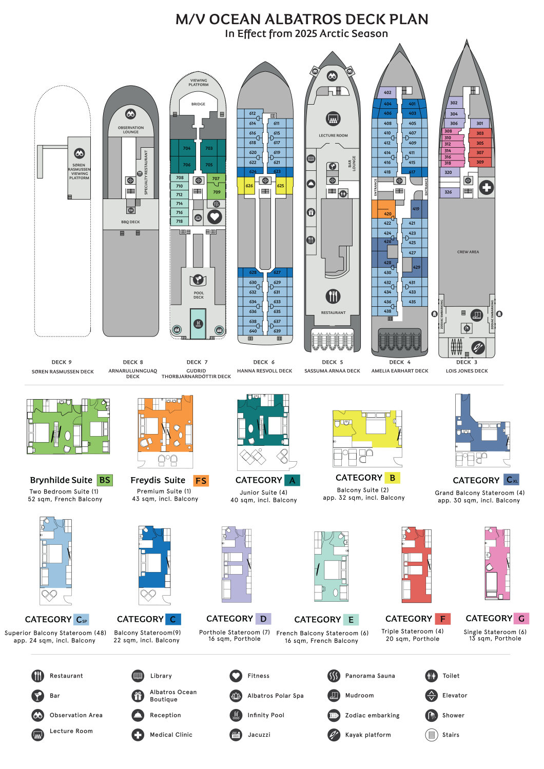 The state-of-the-art luxury vessel Ocean Albatros is one of the most modern small-shipexpedition vessels in the world. This stylish cruise ship is ideally suited to small-ship polar expeditions, with a total of 93 comfortable cabins for guests, all with a view of the ocean, 90% with a balcony. Ocean Albatros is deployed and dedicated to varied Arctic and Antarctica voyages. With the highest Polar code 6 and Ice class 1A, this is the ideal vessel for small-ship cruising due to her sturdy construction and X-BOW® – Infinity class, which provides high stability in rough weather and allows for the smoothest movements on high waves, and a Solas 2012 classification, which facilitates a safe return to port. Part of a brand new generation of low energy vessels, with 4 diesel engines and 2 electro engines, all controlled electronically to optimize speed and fuel consumption, the vessel is also environmentally friendly onboard, with the implementation of the Green Initiative Program. Amenities onboard include a Nordic Bar Lounge, Ocean Shop, various restaurants, including an open deck dining facility, and a highly new and modern lecture lounge.