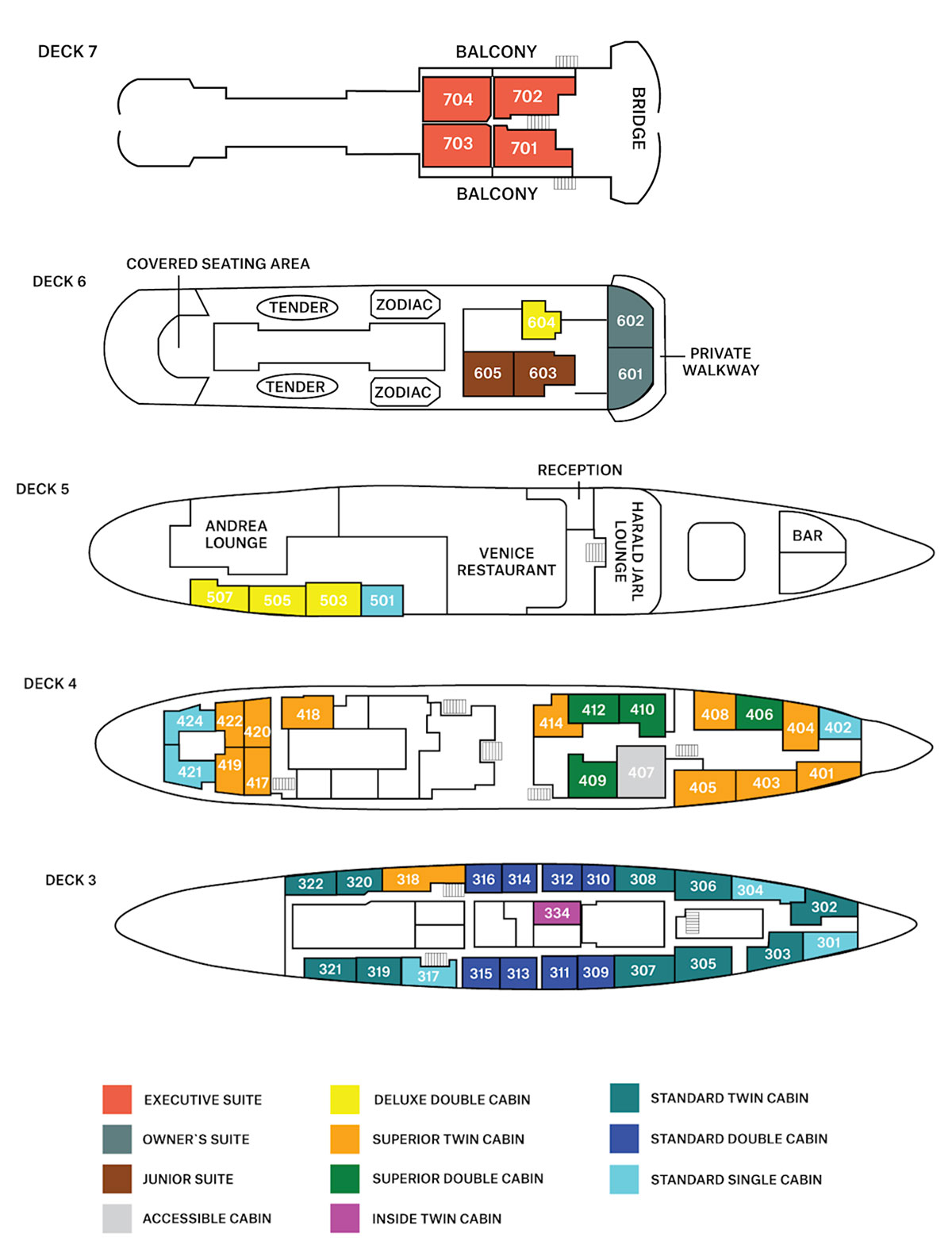 Accommodation ranges from comfortable Standard or Superior cabins in single, twin or double bed configuration - all with private bathroom and portholes, or Deluxe cabins with windows. A small number of larger suites are available, with windows and one with balcony.