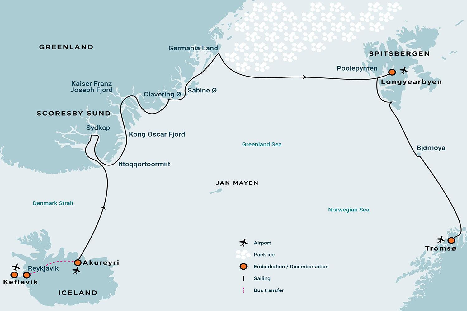 Chart an epic course from Iceland into the mazy fjords of Greenland and the beautiful world of the pack ice as you head north. Crossing the Greenland Sea, this combination cruise then takes you through the Svalbard Archipelago, exploring glaciers, mountains, and tundra, before crossing the Norwegian Sea and stopping at Bear Island en routeItinerary