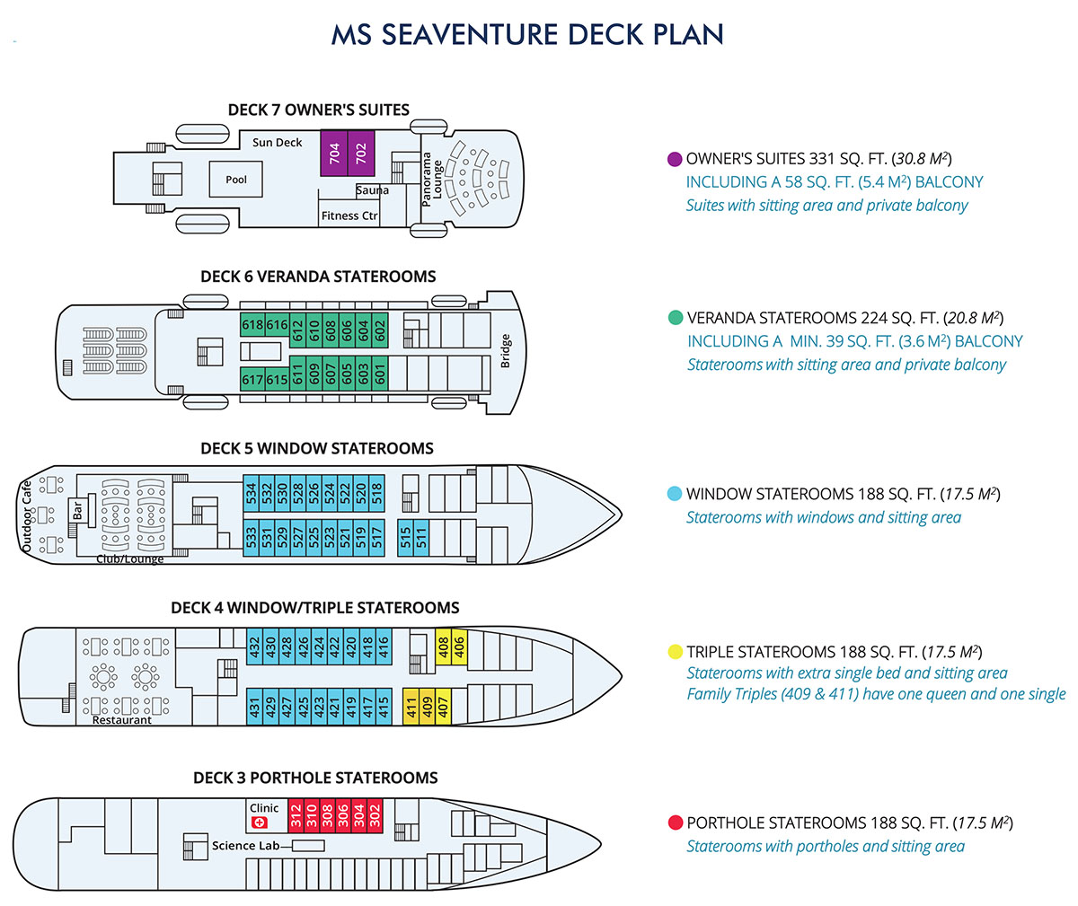 Seaventure features a 1-A Super ice class rating — the highest ice class awarded to passenger vessels. This means that we will be able to explore coves, bays, and channels that would previously have been forbidden to us. The ship also offers a host of new activities. There’s a sauna, a fitness center, a custom-built citizen science lab, and heated saltwater pool. There is more storage space, which is important because it means we can carry more equipment, so that more of our guests can participate in activities like kayaking, snowshoeing, and camping. The common areas are larger and beautifully appointed, and the ship has two kitchens, one on the Lido deck for al fresco dining when weather permits.