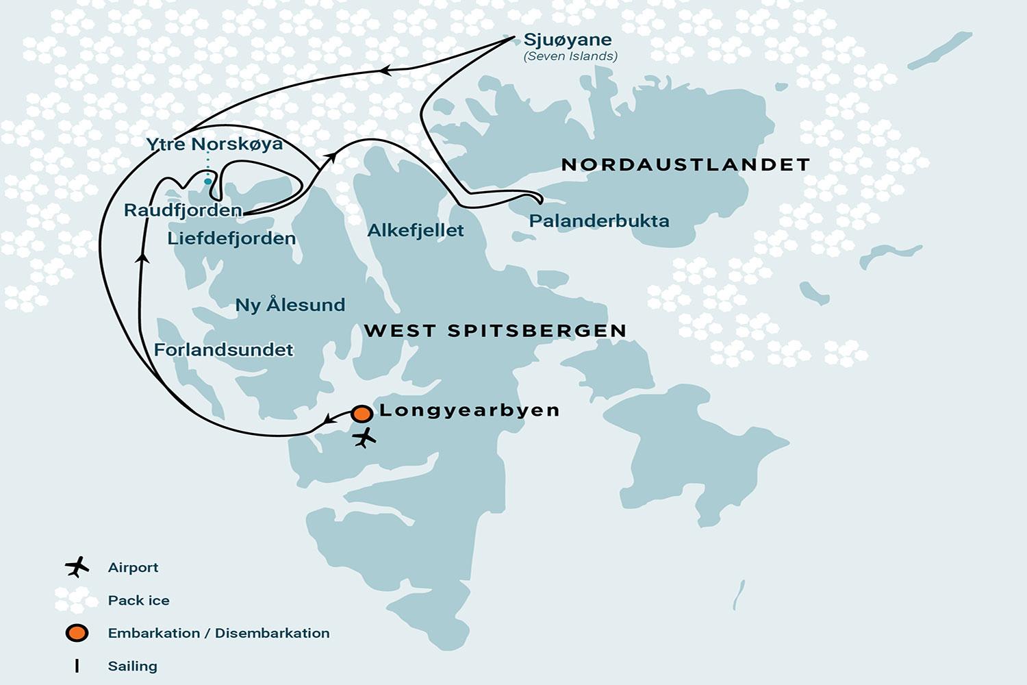 Svalbard, also known as Spitsbergen, is a true high-Arctic archipelago, less than 1000 kilometres (600 miles) from the North Pole. This expedition focuses on the versatility of North Spitsbergen’s visually stunning landscapes, vast spans of sea ice, and many opportunities to spot whales, polar bears, seabirds, walruses, and other such wildlife. Enjoy the fantastically beautiful landscapes, adventurous landings, and shoreline hikes. Optional kayaking activity is possibleItinerary