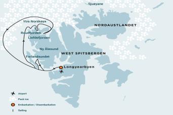 Day 1: Longyearbyen, Svalbard: Largest town, biggest island You touch down in Longyearbyen, the administrative center of Spitsbergen, the largest island of the Svalbard archipelago. Enjoy strolling around this former mining town, whose parish church and Svalbard Museum make for fascinating attractions. Though the countryside appears stark, more than a hundred species of plant have been recorded in it. In the early evening the ship sails out of Isfjorden, where you might spot the first minke whale of your voyage. Day 2 - 9: North Spitsbergen’s natural beauty, wildlife, and pack-ice This voyage will take you into the pack ice and along the remote shorelines of rugged north Spitsbergen. Our landings are subject to change due to sea ice, weather conditions, and wildlife sightings. The expedition leader determines the final plan. Places you might visit include: Raudfjord On the north coast of Spitsbergen, you can enjoy this expansive fjord spilling with glaciers – and maybe even visited by ringed and bearded seals. The cliffs and shoreline at Hamiltonbukta support thriving seabird colonies with Brünnich's guillemots, rich vegetation, and the possibility of polar bears. We will try to land at Alicehamna or Buchananhalvøya. Ytre Norskøya This small island was used for many years as a lookout point for Dutch whalers, and in fact we can still follow their tracks to the summit of the island. The remains of 17th-century blubber ovens can also be seen near about 200 graves. The north side of the island offers the rare opportunity to see puffins near their breeding places, and there is even a small colony of kittiwakes. Monaco Glacier Depending on the weather and sea ice, you could sail into Liefdefjorden, land at Texas Bar and cruise within sight of the 5-kilometer-long (3.1 miles) face of Monaco Glacier. The waters in front of this precipitous glacier are a favorite feeding spot for thousands of kittiwakes, and the base of the ice is a popular polar bear hunting ground. If ice conditions prevent us from sailing here early in the season, we can implement an alternate route along the west coast of Spitsbergen. Northwest of Raudfjord We aim to sail into the pack ice outside the territorial waters of Svalbard, watching for polar bears and elusive Greenland (bowhead) whales. As we sail from 80 N to 76 N along and in the outer fringes of the ice edge, we will also look for harp seals, hooded seals, polar bears, and migrating seabirds like little auks, Brünnich’s guillemots, and kittiwakes. On previous voyages in this area, we have sometimes seen up to hundred bowhead whales. We also have the chance to see northern bottlenose whales and the first fin whales of the season. The pack ice sailing will be a highlight of this voyage and may take up to three days. Sailing in the pack ice We aim to sail into the pack ice at quite some distance from the coast of Spitsbergen, watching for polar bears and other animals at the edges of the pack. Our voyage through the pack ice may be a multi-day affair, depending on the position of the ice and local sea and weather conditions. Regardless of how long we spend in the ice, these days at sea will be a highlight of the trip. Note that while the ship navigates the pack ice, we will not make any shore landings or excursions from the ship. However, wildlife encounters are the main draw here, with good chances to encounter many species that thrive in this icy habitat, including polar bears, seals, and whales. After our time on the ice, we will retrace our route west, keeping watch for polar bears, ringed seals, and elusive Greenland (bowhead) whales. This is also the habitat of ivory gulls. About 40 nautical miles (74 km) west of Spitsbergen, we will sail along the edge of the continental shelf. Here, fin whales forage during the summer in the upwelling zones (where cold, nutrient-rich water wells up from below the sea’s surface) that run along the Spitsbergen banks. At the mouth of Kongsfjorden, you will have a good chance of sighting minke whales. Forlandsundet, St. Johns Fjord, or Alkhornet Walruses sometimes haul out in Forlandsundet at Poolepynten. Alternatively, we might sail into St. Johns Fjord or south to the mouth of Isfjorden, landing at Alkhornet. Seabirds nest on these cliffs, Arctic foxes search below for fallen eggs and chicks, and reindeer graze the sparse vegetation. Day 10: Longyearbyen - There and back again The vessel will arrive back in Longyearbyen in the early morning. Bus transportation to the airport will be provided. Note All itineraries are for guidance only. Programs may vary depending on ice, weather, and wildlife conditions. Landings are subject to site availabilities, permissions, and environmental concerns per AECO regulations. Official sailing plans and landing slots are scheduled with AECO prior to the start of the season, but the expedition leader determines the final plan. Flexibility is paramount for expedition cruises. The average cruising speed of our vessel is 10.5 knots.Scrolling is disabled on map, please click to enable.