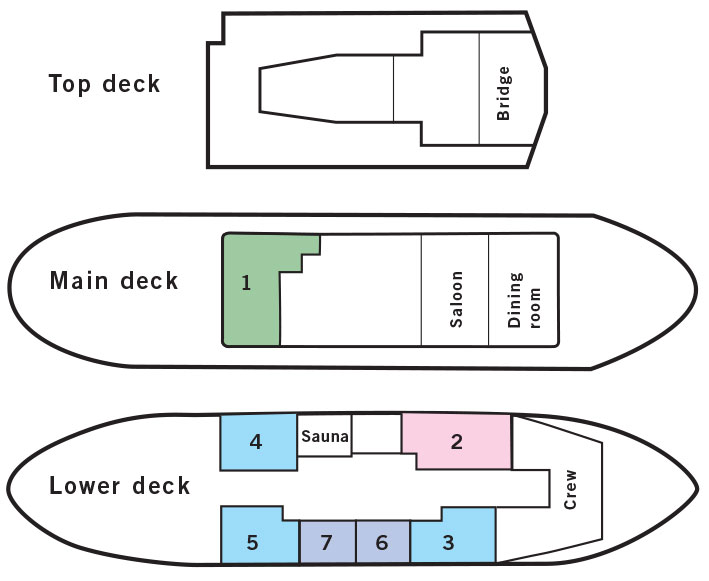 On the guest deck you also find a small sauna with a cold shower. The richly appointed saloon and the beautiful dining messroom feature crotch-mahogany panelling, a bar, a library, coffee and tea stations. There are several open and semi enclosed deck spaces from where you can enjoy the stunning Arctic sceneries.