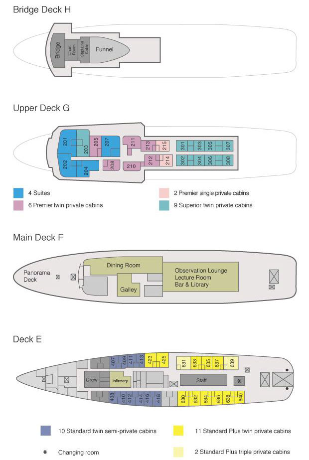 All rates are quoted per person, based on shared twin or triple occupancy. If you are travelling alone and wish to share, you will be matched with another person of the same gender at the shared rate. Two dedicated Premier single cabins are available at a special single rate. A limited number of twin cabins are also available for single occupancy at 1.5 times the share rate. Suites may be reserved at 2 times the share rate. A third berth in the Suites and Superior may be occupied at 50% of the published twin share rate.