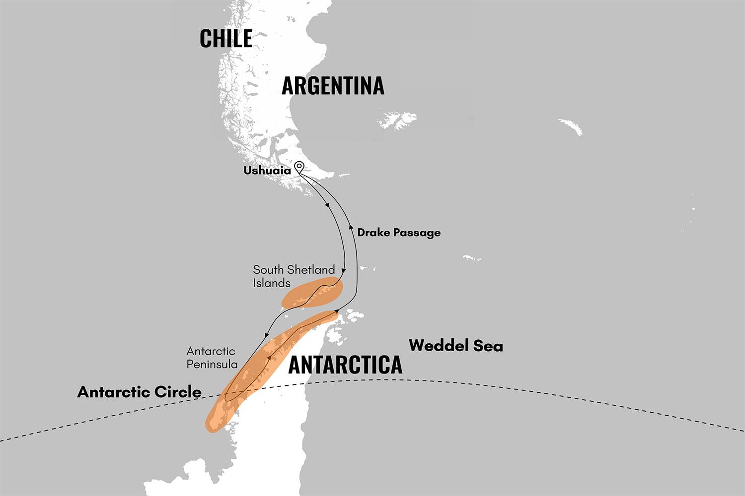 Day 1: Ushuaia, Argentina Board the expedition vessel in the afternoon, where you'll meet your crew and fellow travellers. After settling into your cabin, the ship sets off along the picturesque Beagle Channel. Relish your first evening at sea as the southernmost tip of South America disappears from view. Days 2-3: Crossing the Drake Passage Start your Antarctic adventure with a crossing of the Drake Passage, a vast stretch of open ocean that marks the Antarctic Convergence, where nutrient-rich waters sustain a vibrant ecosystem. While at sea, attend expert-led talks on Antarctica’s history, wildlife, and geology. Head to the open decks or the bridge to spot albatrosses, petrels, and even whales. Adventure activities, including navigation workshops and safety briefings for kayaking and snowshoeing, will also be held. By the end of Day 3, the first sighting of icebergs and snow-capped peaks will signal your arrival at the South Shetland Islands. Days 4-9: Exploring the Antarctic Peninsula and Venturing below the Antarctic Circle Explore the wonders of the Antarctic Peninsula and South Shetland Islands, where towering icebergs, pristine glaciers, and dramatic landscapes define the ultimate polar wilderness. Highlights Include: Kayaking Among Icebergs: Paddle through tranquil waters, drifting past seals resting on ice floes and penguins diving in for a swim. Snowshoeing Adventures: Strap on snowshoes to explore pristine trails and reach panoramic viewpoints, offering breathtaking vistas of glaciers and peaks. Penguin Colonies: Visit expansive rookeries of Gentoo, Chinstrap, and Adélie Penguins, watching their amusing behaviours as they care for their chicks or brave the frigid waters. Wildlife Encounters: Spot Weddell, crabeater, and leopard seals lounging on ice or hunting in the water, with Minke and humpback whales often seen feeding nearby. Zodiac Cruises: Navigate ice-filled waters for close-up views of wildlife and ice formations. Scenic Waterways: Sail through some of Antarctica’s most iconic passages, such as the Gerlache Strait, Errera Channel, and Lemaire Channel, often referred to as the “Kodak Gap” for its spectacular scenery. Go Deeper and Further! With over 500 landing sites along the Antarctic Peninsula, no two voyages are ever the same. Our expert team designs each expedition based on weather, conditions, and opportunities for the most remarkable encounters. As vessel traffic grows, our deep regional knowledge ensures we go beyond the usual paths—navigating ice-filled channels, towering glaciers, and wildlife-rich shores. Guided by an experienced crew, this is more than a cruise—it’s a true expedition defined by spontaneity and discovery. Expect close encounters with Adélie, Gentoo, and Chinstrap penguins, seals, and whales, as we set our sights on the elusive Polar Circle. Days 10-11: Crossing the Drake Passage (Northbound) Say goodbye to the icy wilderness as we embark on our return journey across the Drake Passage. Reflect on the incredible sights and adventures of the past days. Attend final lectures and workshops or unwind on deck, keeping an eye out for seabirds and marine life. Conclude your Antarctic expedition with a farewell dinner on the final evening. Day 12: Return to Ushuaia Arrive back in Ushuaia in the early morning. After breakfast, disembark with cherished memories of an epic Antarctic expedition and new stories to tell. Please note: The above itinerary is a general guideline. Our precise route and activities will be adjusted to optimize wildlife viewing and adapt to prevailing weather and ice conditions. The Captain and/or Expedition Leader will make necessary changes to ensure the best possible experience. A daily program will be provided onboard. Flexibility is essential for a successful expedition.Scrolling is disabled on map, please click to enable.
