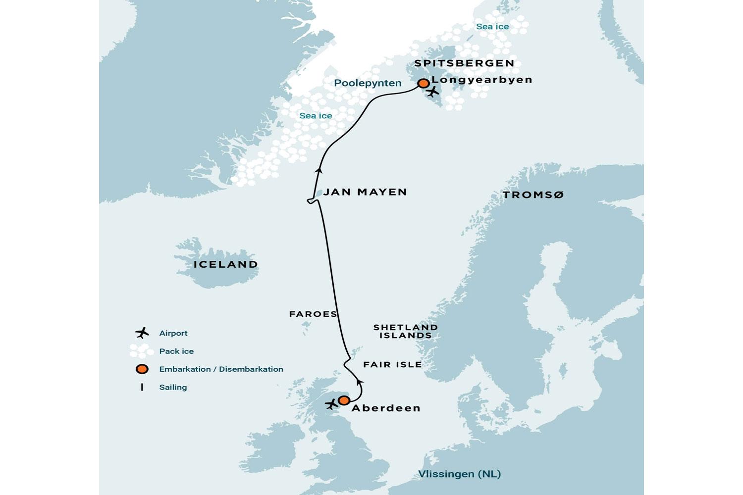 Day 1: Aberdeen, Scotland - Sights of the Granite City You arrive in Aberdeen, the Granite City, frequent winner of the Britain in Bloom competition. This is the true start of your trip. Several cetaceans, including orcas (killer whales), are native to these seas. To the south you see the lighthouse on Girdle Ness that was designed by the grandfather of Robert Louis Stevenson, the famed Scottish writer who gave us such classics as Treasure Island and Dr. Jekyll and Mr. Hyde. More passengers join you in Aberdeen. Day 2: Birds, seals, and world-famous knits We plan to stay the day on Fair Isle, an island in the Shetlands whose seventy-odd inhabitants are known for their beautiful knitwear. This is a fantastic location with accessible seabird breeding grounds, and you may even spot grey seals. Day 3 – 4: Jan Mayen marine life You sail north to the Norwegian island of Jan Mayen, 300 nautical miles northeast of Iceland. Your two days at sea do not pass idly, however. Keep a close lookout for any spouts of water from the surrounding seas, heralding the arrival of a minke, fin, orca, or blue whale. Day 5: Snow-capped seaside volcano Jan Mayen is a stark volcanic island crowned by the snow-capped summit of Mt. Beerenberg. From the slopes of this imposing 2,300-meter-high (7,545 feet) volcano, broken glaciers grasp out into the frigid sea. With permission from the Norwegian authorities, you can now visit the weather station. You can also walk to the remains of a 17th-century Dutch whaling station amid the thick moss beds of this stark volcanic landscape. Day 6 – 8: Under the midnight sun & along the ice edge Basking in the midnight sun, you sail north along the edge of the sea ice in search of bowhead whales, harp seals, polar bears, and a variety of seabirds. You then change direction after about 79° north, cutting west to the rocky edges of the continental shelf of west Spitsbergen. Here you have a good chance of seeing fin whales and – near the glacial mouths of the gaping Spitsbergen fjords – surfacing minke whales. Day 9: The Arctic island of Spitsbergen Forlandsundet, between the main island of Spitsbergen and the narrow Prins Karls Forland, is a place of great beauty and fascinating wildlife. Walruses sometimes haul out here. Alternatively, you might sail into St. Johns Fjord or head south to the mouth of Isfjorden, landing at Alkhornet. Seabirds nest on these cliffs, Arctic foxes search below for fallen eggs and chicks, and reindeer graze the sparse vegetation. Day 10: Journey’s end in Longyearbyen Every adventure, no matter how grand, must eventually come to an end. You disembark in Longyearbyen, the administrative center of Spitsbergen, taking home memories that will accompany you wherever your next adventure lies. But if you’re still craving additional chances to spot the Arctic’s most iconic apex predator, stay on board for our seven-night North Spitsbergen Explorer - Versatile landscapes, sea ice & wildlife voyage. PLEASE NOTE: All itineraries are for guidance only. Programs may vary depending on ice, weather, and wildlife conditions. Landings are subject to site availabilities, permissions, and environmental concerns per AECO regulations. Official sailing plans and landing slots are scheduled with AECO prior to the start of the season, but the expedition leader determines the final plan. Flexibility is paramount for expedition cruises. The average cruising speed of our vessel is 10.5 knots.Vessel