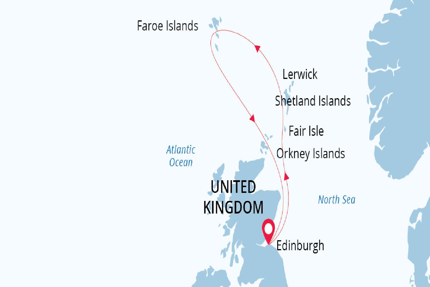 Embark on an unforgettable cruise from the historic city of Edinburgh, Scotland, and set sail through a breathtaking tapestry of stunning landscapes. Traverse the mesmerizing Fair Isle, where nature's beauty unfolds in vibrant hues. Explore the charming town of Lerwick and immerse yourself in the rich cultural heritage of the Shetlands. Venture further to the remote Faroes, where verdant fields stretch as far as the eye can see. Here, wild legends come to life, and the untamed beauty of the landscapes will leave you in awe.Itinerary