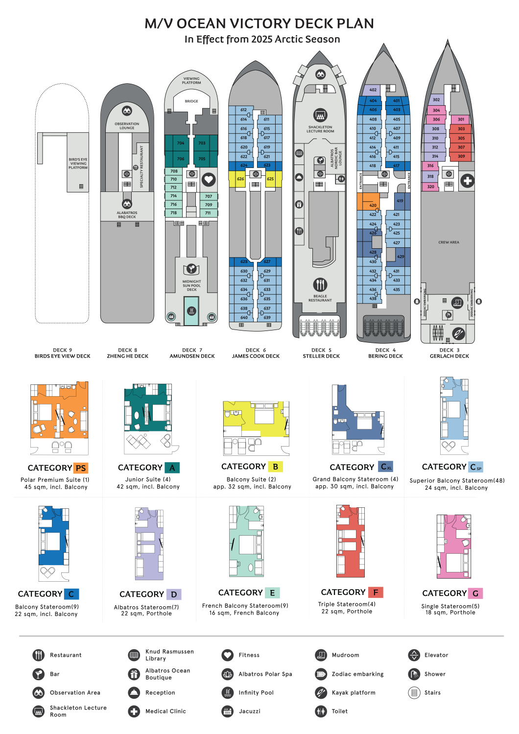 The brand-new luxury infinity vessel Ocean Victory is one of the most modern small ship vessels in the world. This stylish cruise ship is ideally suited to small-ship expeditions, with a total of 93 comfortable cabins for guests, all with a view of the ocean, 90% with a balcony, even a suite with a French balcony! Ocean Victory is deployed and dedicated to varied Antarctica voyages. With the highest Polar code 6 and Ice class 1A, Ocean Victory is the ideal vessel for small-ship cruising due to her sturdy construction and X-BOW® – Infinity class, which provides high stability in rough weather and allows for the smoothest movements on high waves, and a Solas 2012 classification, which facilitates a safe return to port. Part of a brand new generation of low energy vessels, with 4 diesel engines and 2 electro engines, all controlled electronically to optimize speed and fuel consumption, the Ocean Victory will also be environmentally friendly onboard, with the implementation of the Green Initiative Program. Amenities onboard include a Nordic Bar Lounge, Ocean Shop, various restaurants, including an open deck dining facility, and a highly new and modern lecture lounge.