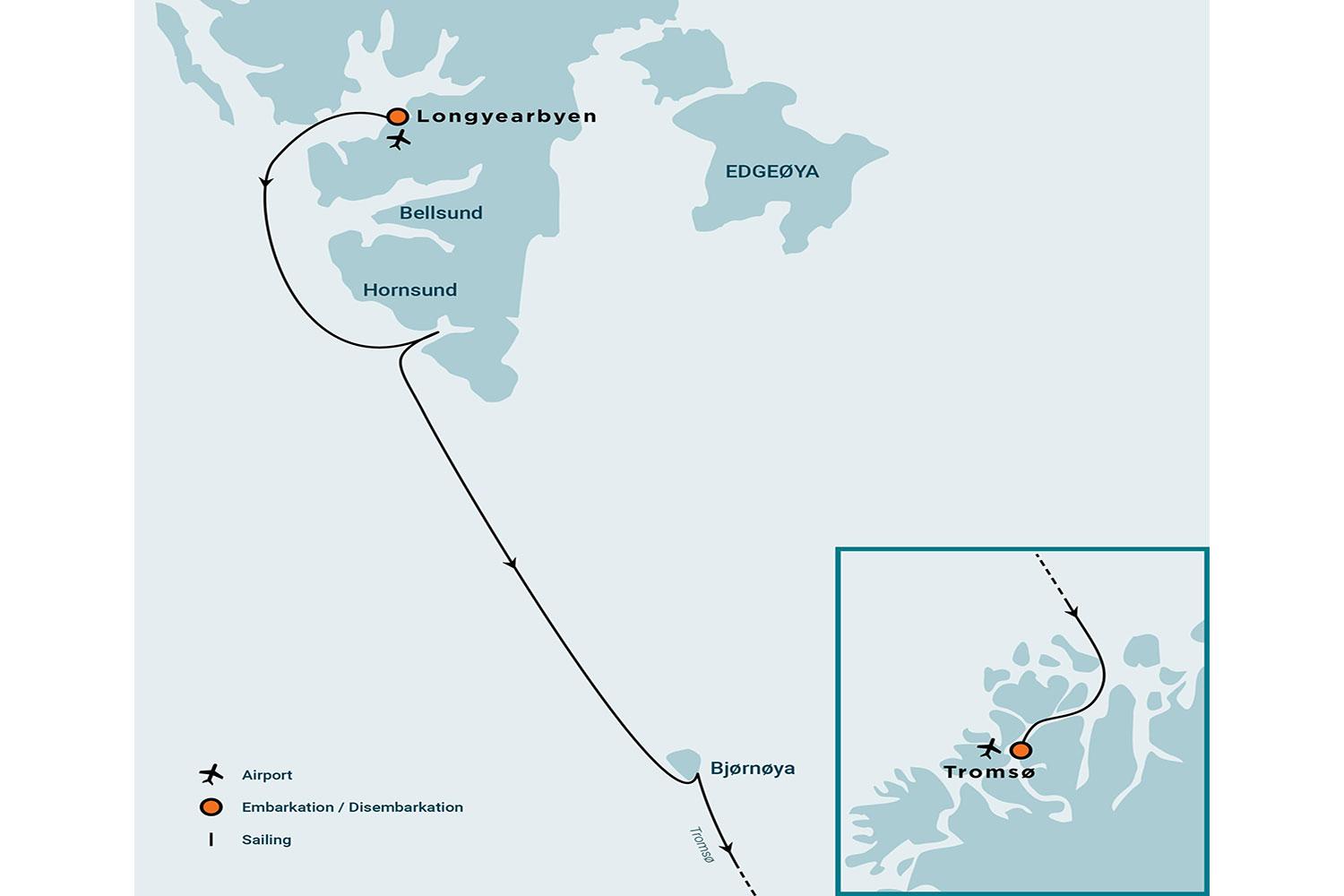Day 1: Longyearbyen - Largest town, biggest island You touch down in Longyearbyen, the administrative center of Spitsbergen, the largest island of the Svalbard archipelago. Enjoy strolling around this former mining town, whose parish church and Svalbard Museum are fascinating attractions. Though the countryside appears stark, more than a hundred plant species have been recorded here. In the early evening, the ship sails out of Isfjorden, where we might spot the first minke whale of the voyage. Day 2: Spectacular Hornsund We start the day by quietly cruising the side fjords of the spectacular Hornsund area in southern Spitsbergen, enjoying the scenery of towering mountain peaks. The mountain of Hornsundtind rises to 1,431 meters (4,695 feet), while the peak of Bautaen testifies to why early Dutch explorers gave this island the name Spitsbergen, meaning "pointed mountains." There are 14 magnificent glaciers in the area, and we have a chance of encountering seals and polar bears. The bird cliffs are now mostly quiet, with many species having departed aside from some first-year fulmars. Day 3: Isolated Bear Island We arrive at the southeastern end of Bear Island, an excellent place for viewing the high cliff faces and "Perleporten." Northward, in Kvalrossbukta, the opportunity to land and visit the remains of a whaling station from early in the previous century should present itself. We might also land in a shallow valley, such as Rendalen. Day 4 - 5: Toward Norway, Aurora Borealis Sailing southward, we are likely to see whales in the surrounding sea, and when night falls again, we have a good chance to see the Aurora Borealis in the skies above. Day 6: Arrive in Tromsø (Norway) Tromsø, also known as the gate to the Arctic, has been an important town from where Arctic expeditions set out to the north for centuries. From here, one can fly to Oslo and beyond. PLEASE NOTE: All itineraries are for guidance only. Programs may vary depending on ice, weather, and wildlife conditions. Landings are subject to site availabilities, permissions, and environmental concerns per AECO regulations. Official sailing plans and landing slots are scheduled with AECO prior to the start of the season, but the expedition leader determines the final plan. Flexibility is paramount for expedition cruises. The average cruising speed of our vessel is 10.5 knotsVessel