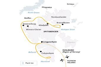 Day 1: Arrive in Helsinki, Finland Arrive in the Finnish capital and make your way to the group hotel located right at Helsinki airport—included in your Charter Flight and Hotel Package You will have the rest of the day to explore explore the many museums, galleries and restaurants, relax at a Finnish sauna or wander the vibrant Design District. If you do plan to visit Helsinki city center, take advantage of the convenient 40-minute rail service from the airport. Day 2: Fly to Longyearbyen, Svalbard, and embark After breakfast, the group will transfer to the Helsinki airport and board our private charter flight to Longyearbyen, as part of the Charter Flight & Hotel Package. Our journey to the High Arctic now truly begins. You will see the coastal and birch forests of southern Scandinavia give way to taiga and tundra environments, the mountains of Norway and northern Sweden, and the convergence of the Norwegian and Barents seas. Approaching Svalbard, you may get your first views of a pure, snow-capped wilderness, complete with ridgelines, glaciers, and perhaps even sea ice in the distance. We land in Longyearbyen, Svalbard’s largest settlement, and transfer to the harbor where we will embark on our ship. Day 3 to 9: Summer in the Svalbard wilderness Svalbard is a true Arctic environment, where many iconic species spend their entire lives, entwined with the winter and spring sea ice. But with the arrival of summer—brief as it is—the archipelago bursts to life as countless migratory species settle in to take advantage of the season’s endless daylight and abundant food. Chief among Svalbard’s summer migrants are seabirds, waterfowl, and other birds, joined by marine visitors such as baleen whales—including the mighty blue whale. Though wildlife sightings aren’t guaranteed, these giants are sometimes observed foraging in the rich Arctic waters. A fragile polar ecosystem Under the midnight sun, plant life also flourishes. While less diverse than in southern regions, Svalbard hosts hundreds of plant, lichen, and moss species, from hardy grasses to vibrant wildflowers. For a few brief months, snow and ice are replaced by pockets of green and splashes of color, framed by snowcapped peaks —a fleeting transformation of the High Arctic landscape. Throughout the summer, sea ice fractures, melts and disperses. Many species that depend on it shift north and east where ice lingers, or remain ashore until it returns in late fall. While ice may be less frequent, the open water offers greater access to the archipelago’s northern and eastern reaches. If we do encounter ice, we’ll pause to explore it. Myriad of Arctic wildlife At this time of year, wildlife is more often spotted in the water, along shorelines, or gathered in bustling bird colonies clinging to the cliffs. Some terrain here is nearly vertical, with seabirds colonizing every possible ledge. Little auks, guillemots, and puffins nest in rocky crevices, spending the brief summer flying back and forth to feed themselves and their chicks before their f irst flights and plunges. Looking upward while seated in a Zodiac, the sky may seem alive with more birds than you can count, and sometimes we’ll explore near these cliffs on foot. Keep watch for other iconic species too, such as Arctic terns, common eiders, and the occasional king eider. The sounds are astonishing—an Arctic “silence” feels alive with nature’s calls. Standing beneath towering seabird cliffs renders visitors speechless. Summer offers the chance to step ashore and walk on bare ground, though patches of snow can linger. Ashore in the Arctic Summer We may hike into foothills, valleys, and Arctic beaches— land shared with polar bears. While sightings are farther inshore, their paw prints in sand or mud tell their story. Take time to look around and underfoot, where hardy vascular plants and wildflowers bloom. You might also spot driftwood—not from ancient Svalbard forests, but carried here by Arctic currents from Siberia, where tree trunks and branches are swept up in the Arctic currents, ultimately coming to rest here. Additionally, we may see reindeer, as they busily forage on the bountiful summer plant life. Although the weather in midsummer is often cool—even crisp—in midsummer, it’s possible to enjoy reasonably warm days in Svalbard. It’s a surreal experience—feeling the warmth of the summer sun knowing you’re less than 700 nautical miles from the North Pole. As summer warms and sea ice recedes, glaciers come alive—meltwater hastening erosion, tidewater glaciers calving ice with thunderous force. From a Zodiac amid icebergs and brash ice, listen for the crackle of melting ice, the lap of currents, and Arctic terns calling overhead. Pioneering explorers During summer, if conditions align, it might also be possible to visit some of Svalbard’s residents, be they trappers or researchers. There are a number of trappers’ cabins dotted across the archipelago, and the stories their occupants tell bring forth a life wrapped in resourcefulness, grit, humor, and hints of something approaching the magic of nature. Diverse Arctic landing sites With seven full expedition days in Svalbard, we aim to explore a wide range of locations. The order of our journey will be shaped by sea ice conditions, which vary daily. Potential destinations include the spectacular fjord systems of Hornsund, Bellsund, Isfjorden, Krossfjorden, Smeerenburgfjorden, Raudfjorden, Woodfjorden, Sorgfjorden, and others. These fjords feature dramatic mountains rising directly from the sea, folding into endless layers. Glaciers spill from the highlands, many reaching the water’s edge where they calve into the sea. Throughout Svalbard, we may find previously mentioned seabird colonies and other wildlife, as they are distributed throughout the archipelago of islands. Day 10: Disembark in Longyearbyen and fly to Helsinki The time to say goodbye has come. Your adventure ends as it